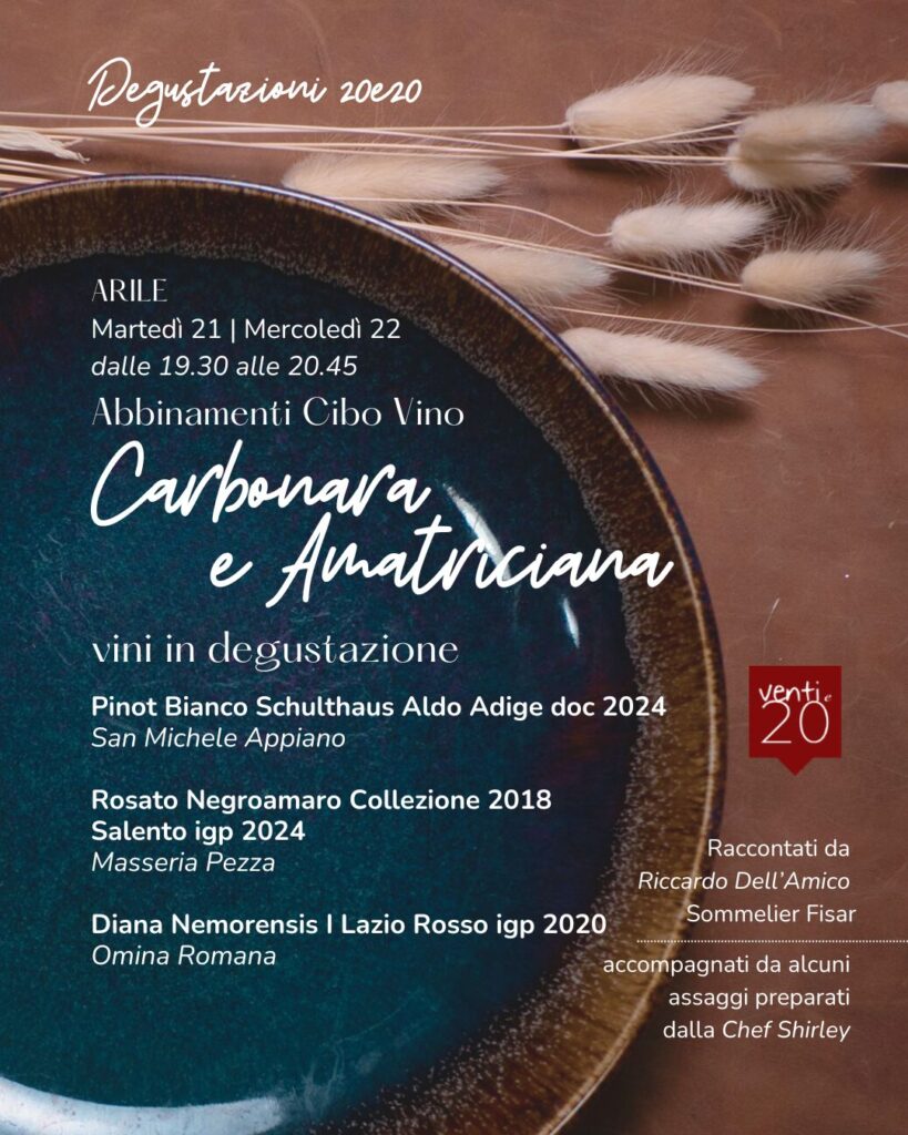 Nella prossima serata, parleremo degli abbinamenti del vino con due paste classiche dove il guanciale è protagonista, la Carbonara e l’Amatriciana.